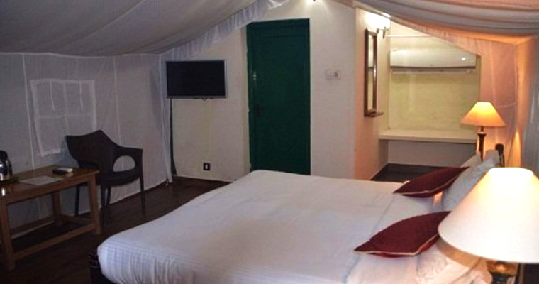 Experience the charm of hut-shaped canvas tents on a steel frame with wooden flooring and boundary walls. Thatched roofs and side covers provide additional insulation, creating a cozy retreat.